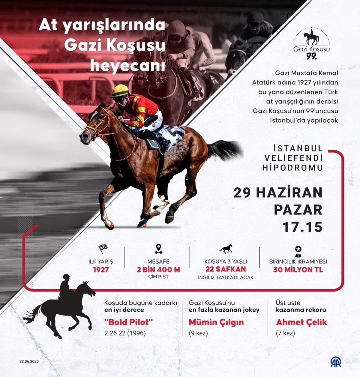 Gazi Koşusu'nun 99'uncusu yarın İstanbul'da yapılacak. Jokey Halis Karataş bir kez daha zaferle ayrılması halinde Ahmet Çelik'i yakalayacak.