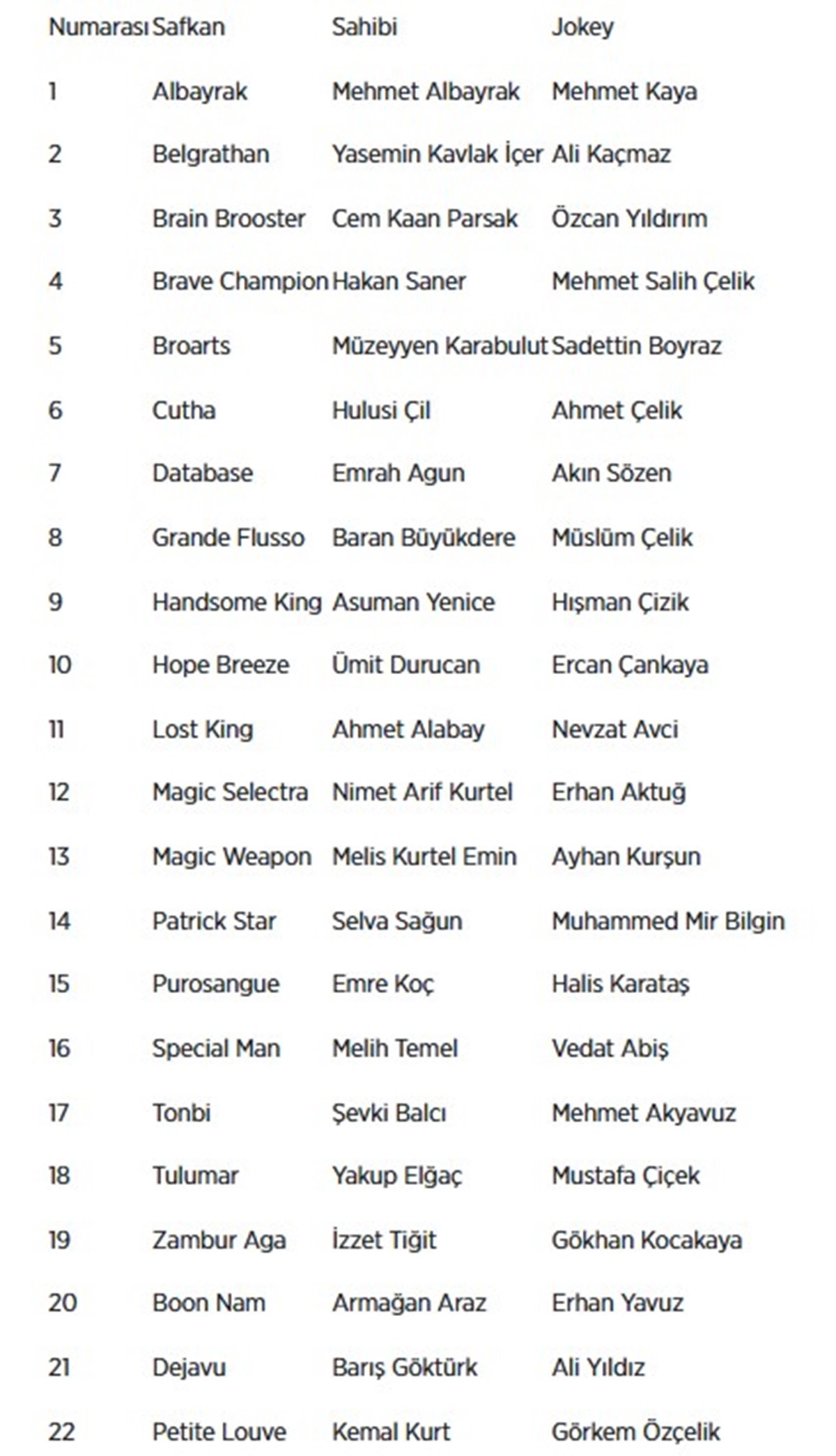Veliefendi Hipodromu'nda gerçekleştirilecek koşu, saat 17.15'te başlayacak. Üç yaşlı safkan İngiliz atlarının yarış hayatlarında sadece bir kez koşabildikleri, 2 bin 400 metre mesafeli çim pistteki koşuya 22 safkan katılacak. Yarış için şu ana kadar 22'si asıl 4'ü yedek olmak üzere 26 safkan kayıt yaptırdı.